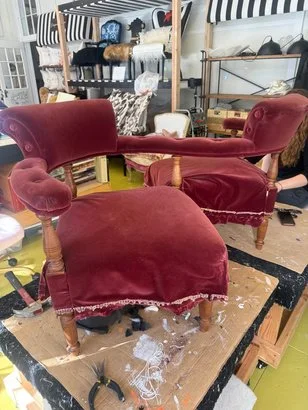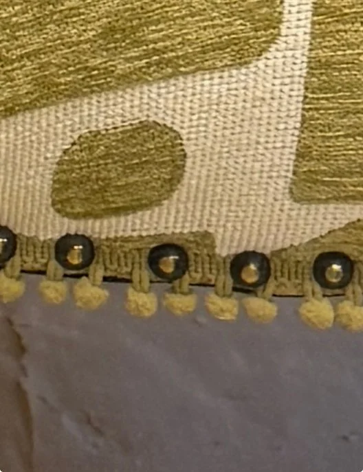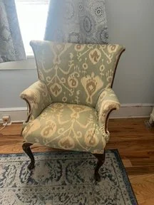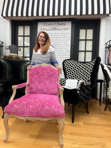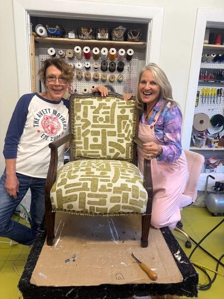 Susan’s chair was a cherished family heirloom in need of a little love and a fresh perspective. She chose a bold velvet contemporary print that brought new life, pizzazz, and panache to the vintage frame—instantly transforming it into a fun, standout piece. With no prior upholstery experience, Susan learned quickly and embraced every step of the process. She even mastered the decorative nail gun like a natural gunslinger —nearly misfiring at us, which gave us all a good laugh. Her finishing touches of mini pom- pom fringe and decorative nail heads added a playful, unexpected twist to what was once an ordinary chair. Along the way, we discovered we grew up in the same hometown at the same time and even knew some of the same people in Boca Raton, making our time together a delightful walk down memory lane.