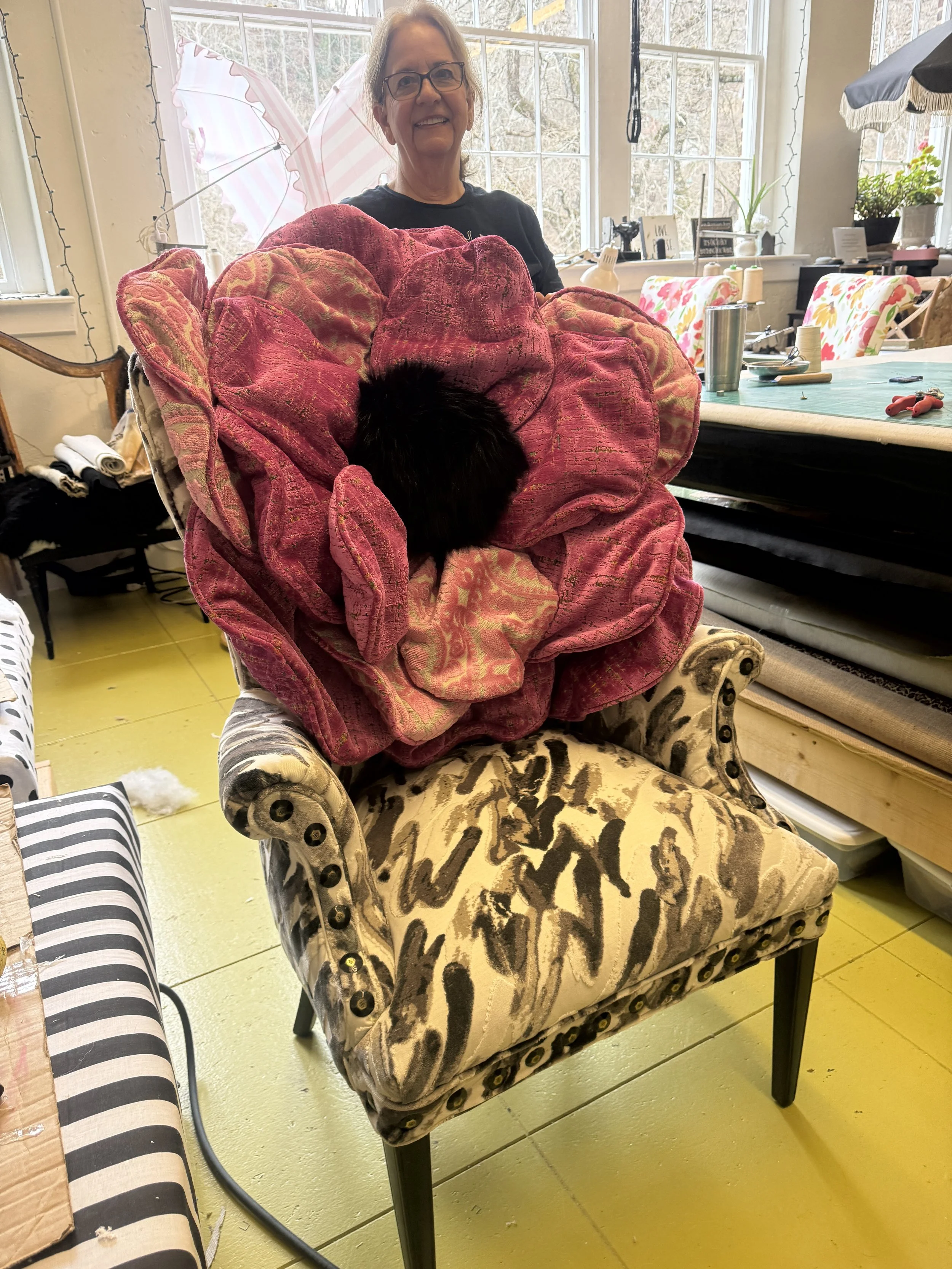 Kaye’s “chair yoga” chair is bright, joyful, and full of life just like Kaye! This simple chair is upholstered in fresh spring green with playful pink floral fabrics, and finished with fun beaded fringe, it brings movement and personality to a supportive yet functional design. This chair reflects both Kaye’s creativity and the confidence she gained, turning mindful practice into something colorful, uplifting, and uniquely her own.