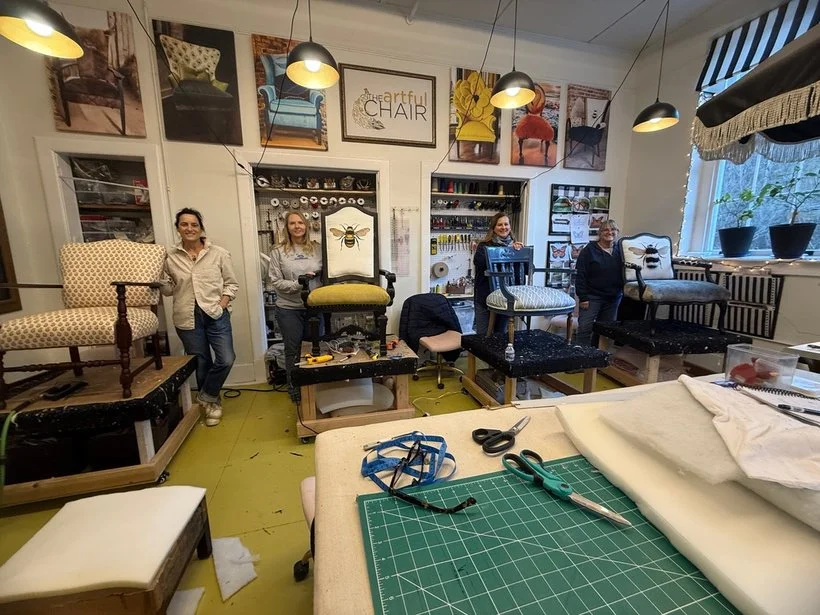 Mary, Sarah, Cindi, and Joan traveled from near and far for a joyful weekend immersion filled with upholstery skills, creativity, and instant friendships. Each chair reflected its maker perfectly. Mary began feeling unsure but left thrilled with her striking Queen Bee chair—gold velvet seat, black velvet dots, and a queen that truly took center stage. She loved it so much she’s considering it for her business logo. Sarah proved a natural, confidently completing two chairs in one weekend with beautifully painted rich blue frames and crisp blue-and-white fabric, all while revealing the beauty of traditional craftsmanship beneath. Cindi, who works in the film industry and brought great stories with her, fell in love with one of my “orphan” chairs and transformed it into a true throne with hand-painted details, layered seating, and nailhead trim. Joan’s enthusiasm lifted everyone—quick to cheer others on, she steadily transformed a tired vintage chair into a sweet, delicate seat and even completed a ruffled footstool in rich cranberry fabric. All of the chairs were perfectly sized for the weekend, and every student learned the basics—and more. What a joy and privilege it was to spend this creative weekend with them.