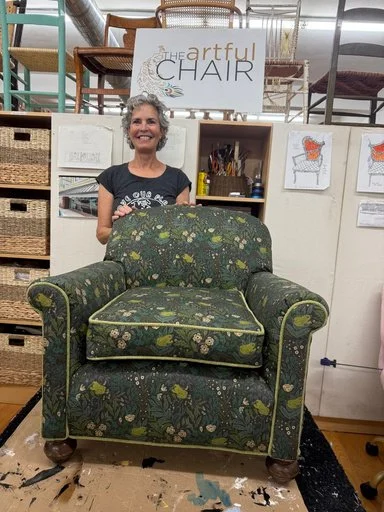 Lucy brought a beautifully aged Arts and Crafts rocker that had been in her family for years—a well-loved piece with a patina full of history. After researching the Arts and Crafts era, she selected a classic artisan-style fabric from Spoonflower that suited the chair perfectly. Along the way, Lucy learned pattern matching and how to properly layer the seat for ultimate comfort, honoring both tradition and function. One day, when my van happened to be parked out front with my TCU license tag on display, Lucy rushed in excitedly—we quickly discovered we attended at the same time. Fellow Horned Frogs forever. It’s truly a small world, and I’m so glad our paths crossed here in Weaverville and that she chose my class to give new life to a cherished family piece.