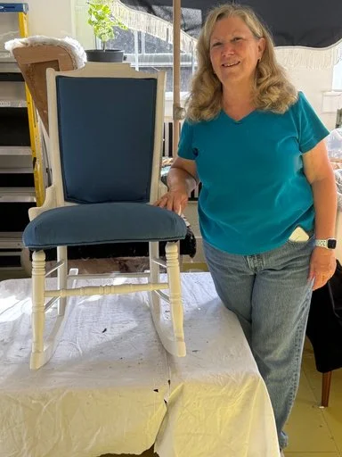Peggy arrived with a sweet vintage rocker that was originally finished in dark brown, but with a fresh coat of Wise Owl One Hour Enamel in white and a rich blue fabric, it was transformed into a true rock star for her daughter. With a special-needs child at home, Peggy needed flexibility, so we created one-on-one upholstery sessions tailored to her schedule. This chair was the perfect piece for learning upholstery basics —taking it apart, layering it back together, and rebuilding it to feel better than new made the process rewarding, hands-on, and truly fun for us both.