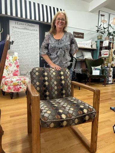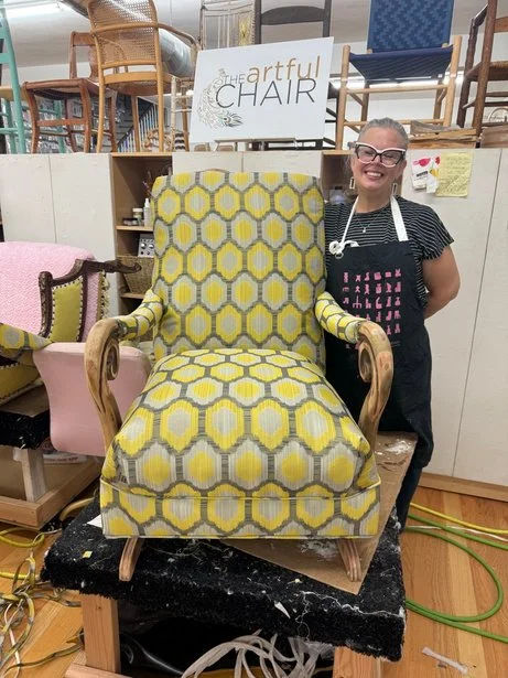 Rebecca’s chair began as a sad, forgotten rocker found on the roadside— and became her very first upholstery success. She transformed it into a fun gray and yellow contemporary statement piece, breathing new life and personality into the frame. Along the way, she learned pattern matching (and nailed it—great job!), proving that skill and confidence grow quickly when creativity leads the way. With her artistic flair shining and her cute chair-motif apron on, Rebecca turned a cast-off into a confident, stylish piece that tells a whole new story.