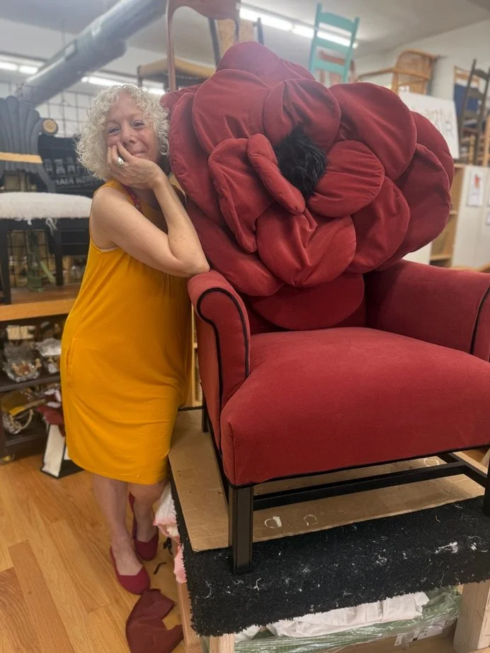 Sharon was ambitious and fearless when she chose to take on one of my Giant Rose Chair designs. Though she was new to upholstery, she didn’t let that stop her. Unbeknownst to her at the start, her simple wing chair held three layers of old fabric, making the tear-down both time-consuming and demanding. Through determination and hard work, Sharon transformed a $15 thrift-store find into a living-room showstopper and true statement piece. That satisfied smile says it all. She was an absolute delight to get to know, and I loved learning about her rich background in broadcasting along the way. I shared her post on the next page! I love when students finish with such JOY!