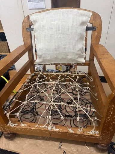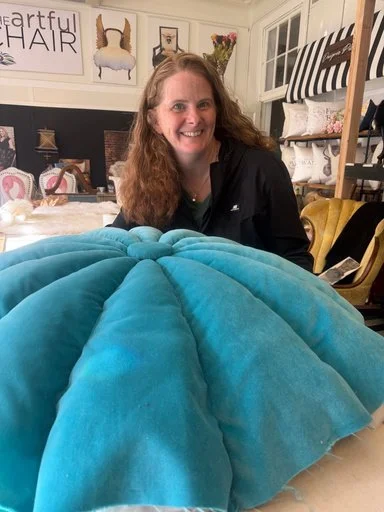 Elise joined my classes on a last-minute whim and quickly revealed herself to be a natural, completing an impressive four projects in record time. From an oversized ottoman perfectly suited to her newly built home, to a beloved childhood chair reimagined for her frog-loving granddaughter, a tailored bench cover, and a sentimental rocker given a beautiful refresh—each piece reflected both skill and heart. A retired dentist, Elise’s steady hands and sharp eye translated seamlessly to upholstery, as she confidently mastered 8- way hand-tied springs, industrial sewing, and precise pattern matching. I feel truly lucky to count her not only as a talented student, but as a friend.