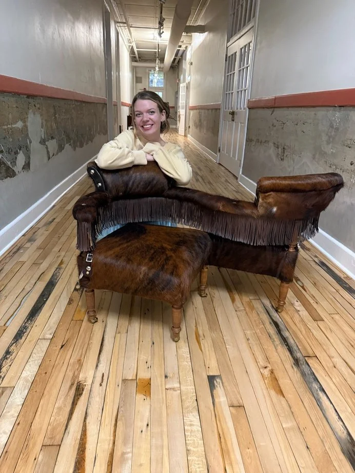 From Vintage Find to Wild West Conversation Piece. Emily is the creative force behind Velvet Vault, her furniture-resale business, and she has a natural eye for reimagining pieces with bold style. She was an absolute pleasure to get to know—both personally and as an artist—bringing energy and creativity that inspired even me. This vintage tête-à-tête courting bench was transformed into a true Wild West conversation piece. Upholstered in hair-on-hide leather and finished with dramatic 6" fringe, nail-head details, and added wheels for extra height and movement, every choice was intentional and fearless. During her time in the studio, Emily upholstered three chairs and took to the craft like a fish to water. As a final surprise, she generously gifted me two of the chairs I had admired on her Facebook page—pieces I genuinely love. Her generosity, talent, and creative spirit made her student experience truly unforgettable. Note: Emily actually did 3 projects during the 8 week class!
